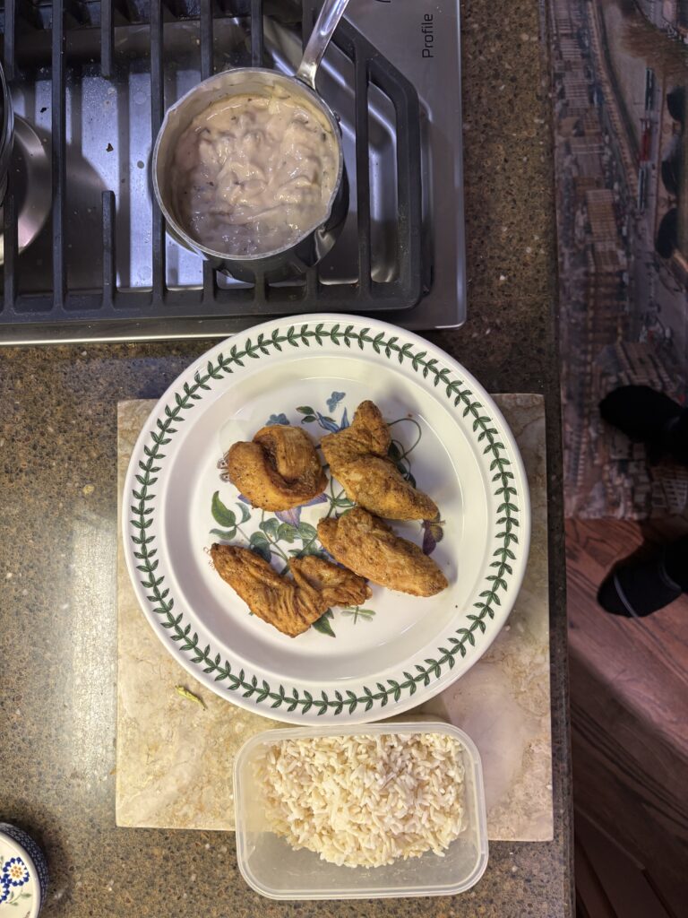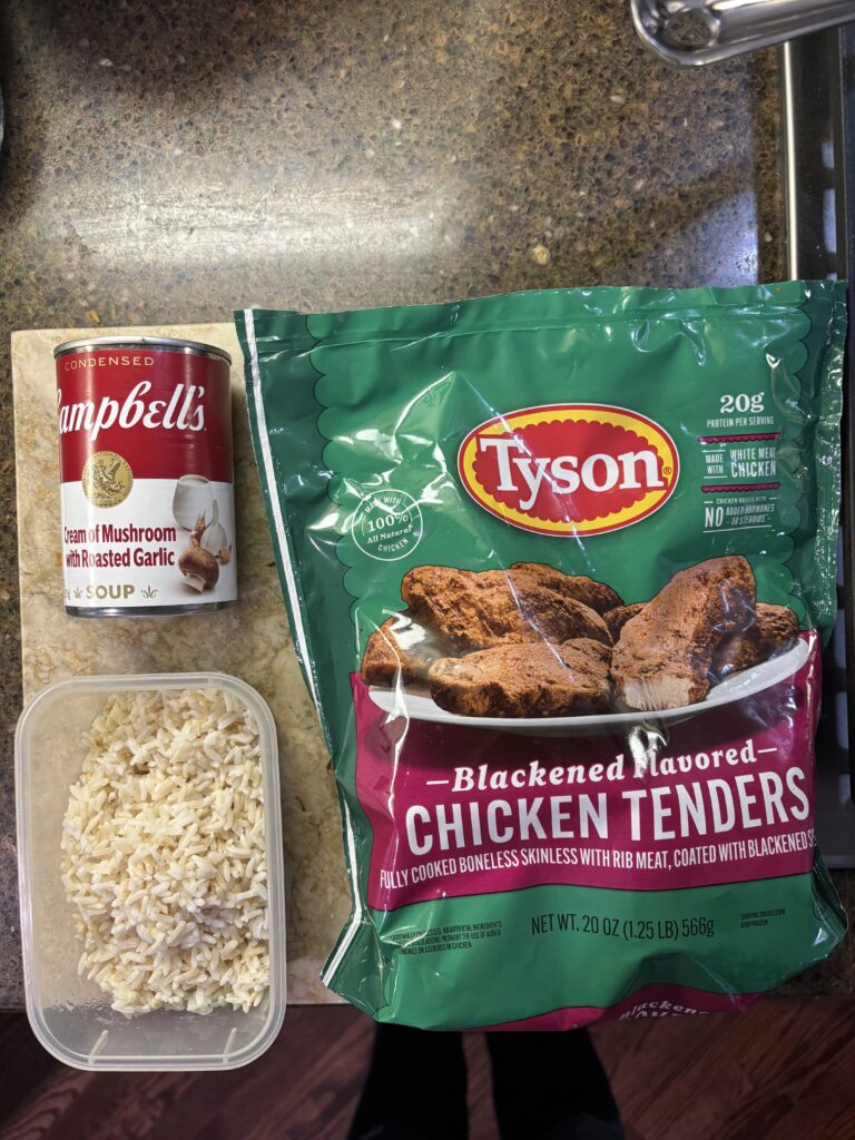 With everything warmed up serve two tenders per plate. Split the left over rice then add soup over chicken and rice. Another easy and economical meal. Spicy too!