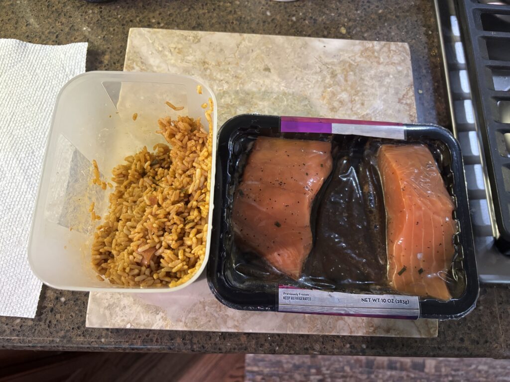 This is an easy one as the salmon comes two to a package already seasoned and the rice was left over from another entree.