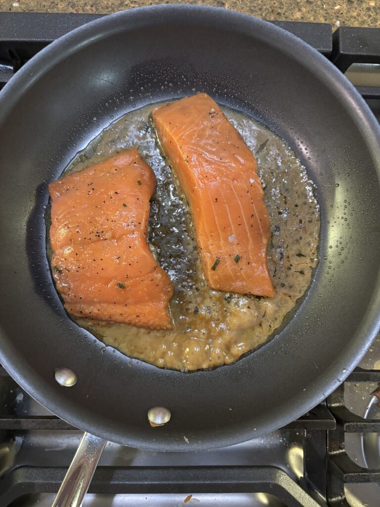 After spraying my pan with pam I open up the package and place each fillet skin down and pour in the extra sauce. As these are already seasoned just apply medium heat.